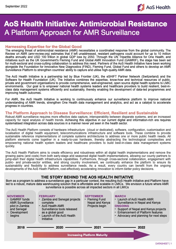 AoS Health began under a Global AMR Innovation Fund (GAMRIF, UK Government) grant, during which a pilot system was developed and implemented in Zambia and Senegal. In 2021 the capabilities of the AoS Health AMR Surveillance System were expanded and the platform implemented in Nepal and Kenya, under the Fleming Fund regional grant programme. Currently at a critical stage of growth, the introduction of a cross-sectoral EAG will allow us to harness our members’ collective expertise to expedite platform capabilities and global reach in order to achieve our goal of developing the ‘reference’ “One Health” country solution for the AMR domain.